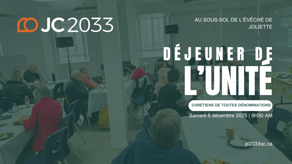 Participez au deuxième déjeuner de l’unité à Joliette le samedi 6 décembre 2025, au sous-sol de l'évêché de Joliette. Un repas fraternel, des chants, un témoignage et un temps de prière pour célébrer notre unité en Jésus-Christ.