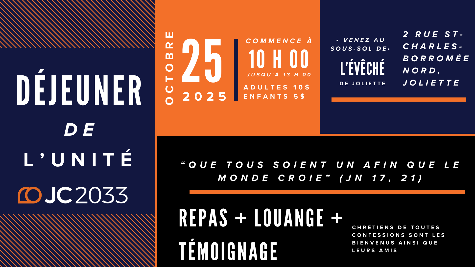 Mots-clés : déjeuner de l’unité à Joliette, unité des chrétiens, rencontre fraternelle, témoignage chrétien, louange et prière, JC2033 Québec